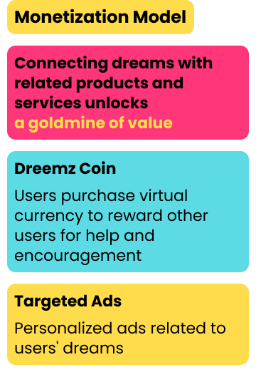 Monetization Model Connecting dreams with related products and services unlocksa goldmine of valueDreemz CoinsUsers purchase virtual currency to reward other users for help and encouragement Targeted Ads Personalized ads related to users' dreams